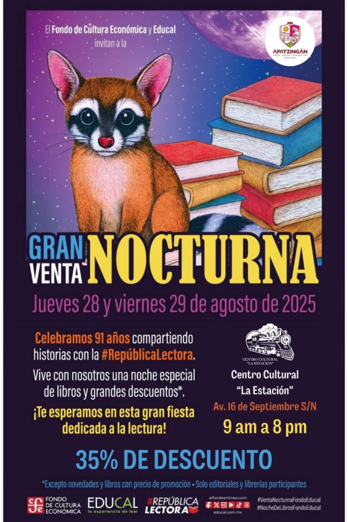 Con el objetivo de acercar la lectura a más familias, estudiantes y docentes apatzinguenses y der la región, el Gobierno Municipal de Apatzingán encabezado por la presidenta Fanny L. Arreola Pichardo, anunció la Gran Venta Nocturna los días 28 y 29 de agosto, ofreciendo hasta el 35% de descuento en una amplia variedad de títulos.