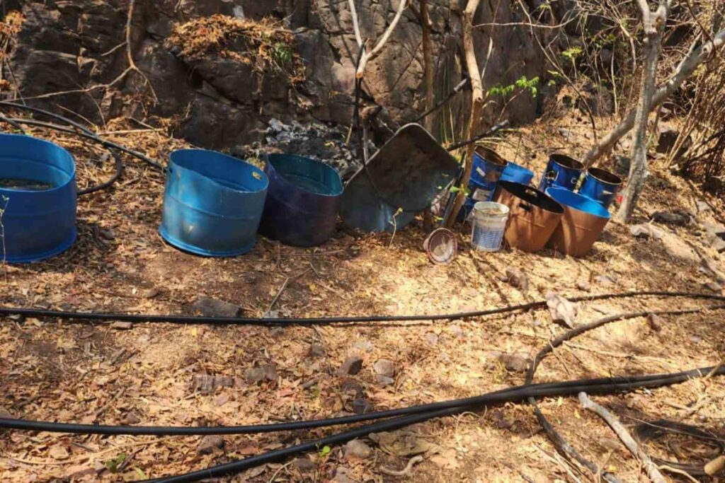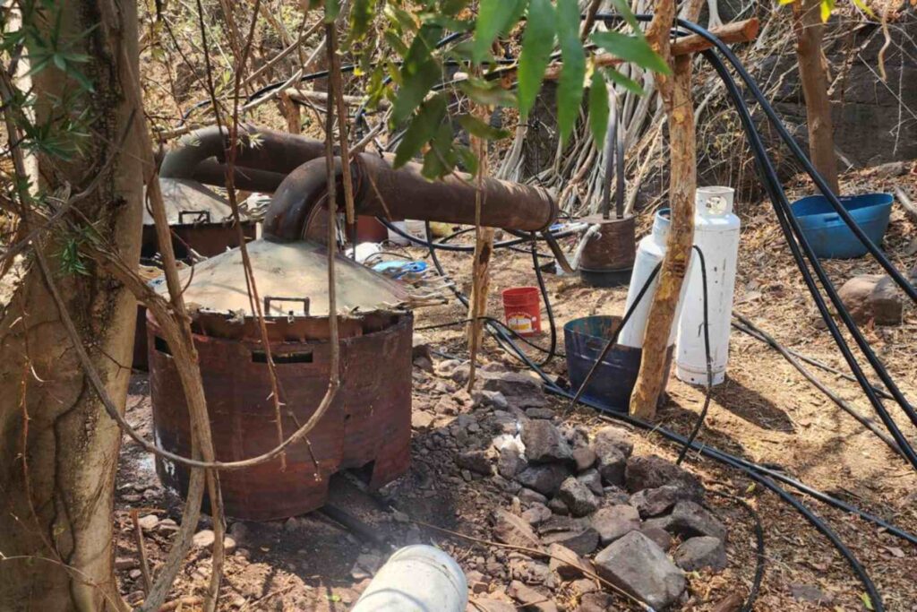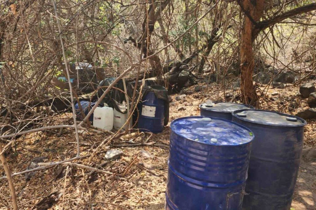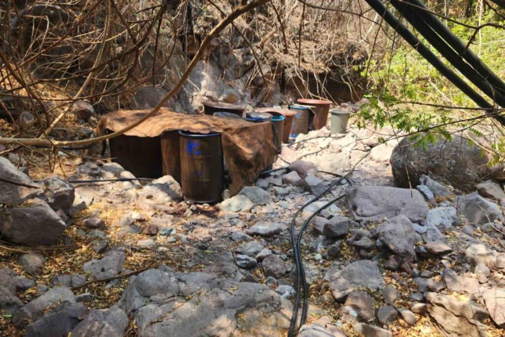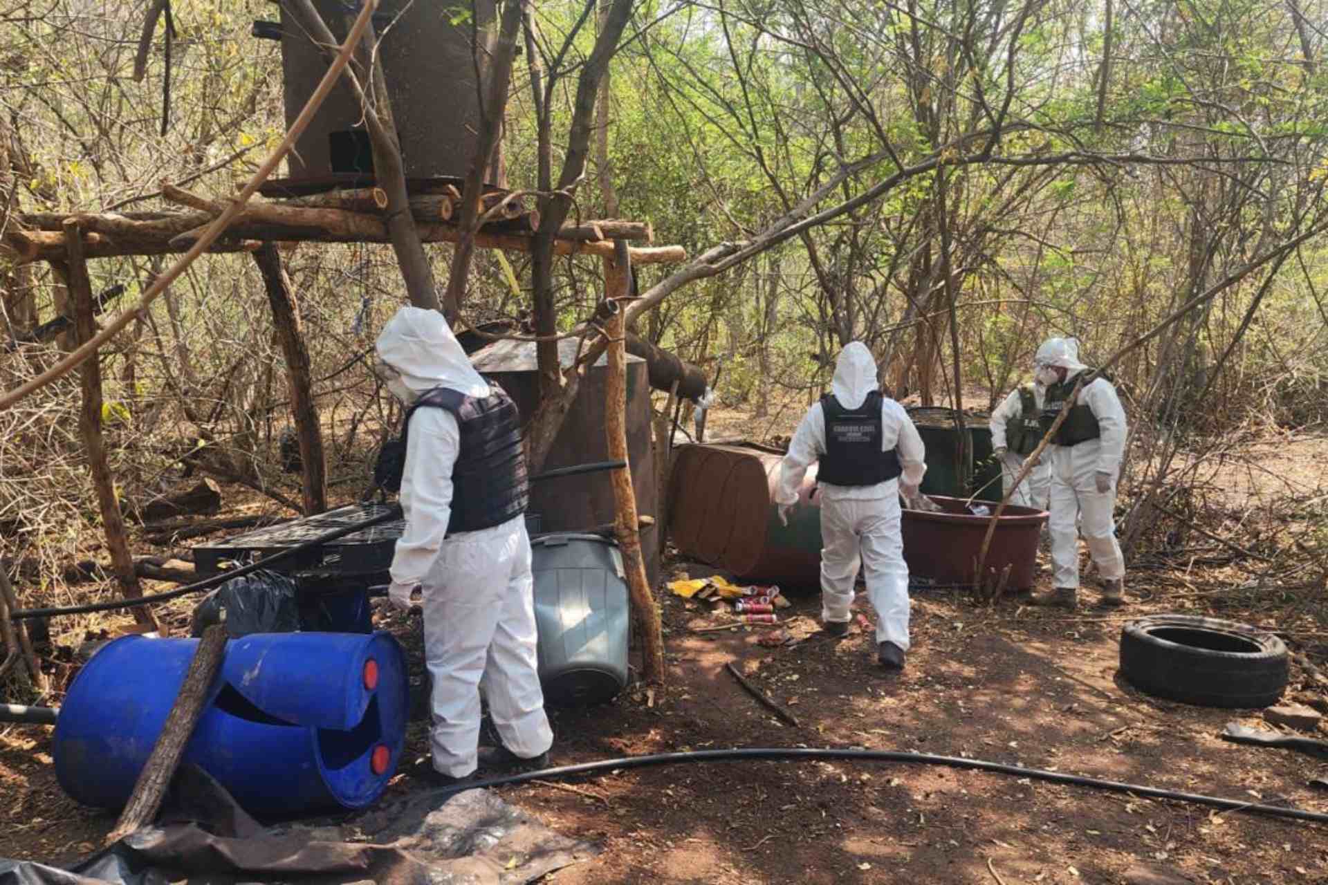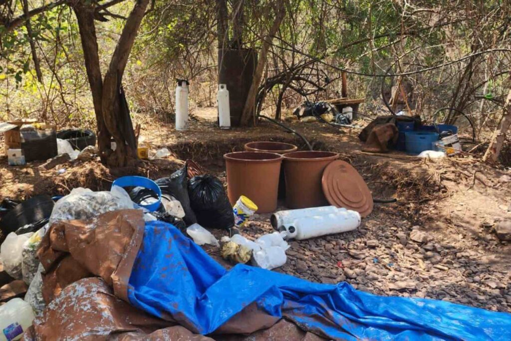 En el lugar se localizaron 20 tambos con capacidad para 200 litros que contenían sustancias químicas, 16 tinas con diversos precursores, cuatro condensadores metálicos, tres reactores, ocho tambos de plástico con capacidad de 200 litros que tenían líquido, cuatro cilindros de gas LP y varios costales.