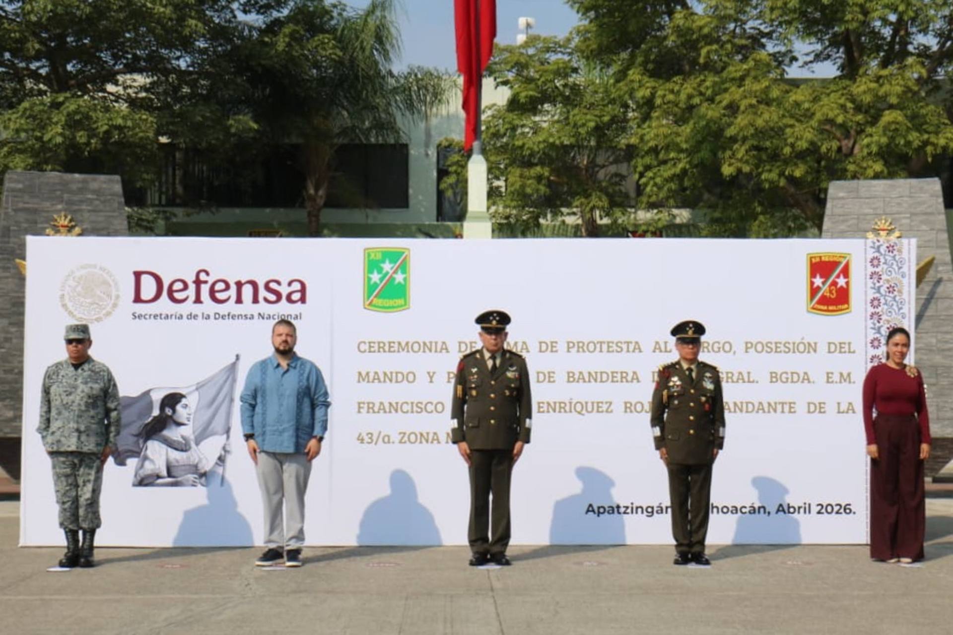 En una ceremonia solemne realizada éste pasado domingo, en las instalaciones del Campo Militar número 43-A, el General de Brigada Diplomado de Estado Mayor, Francisco Antonio Enríquez Rojas, asumió el mando de la 43ª Zona Militar con sede en Apatzingán, en la región de Tierra Caliente y que aglutina los 30/o., 65/o, y 82/o. Batallones de Infantería, con sedes en Apatzingán; Coalcomás y Lazaro Cárdenas, respectivamente.