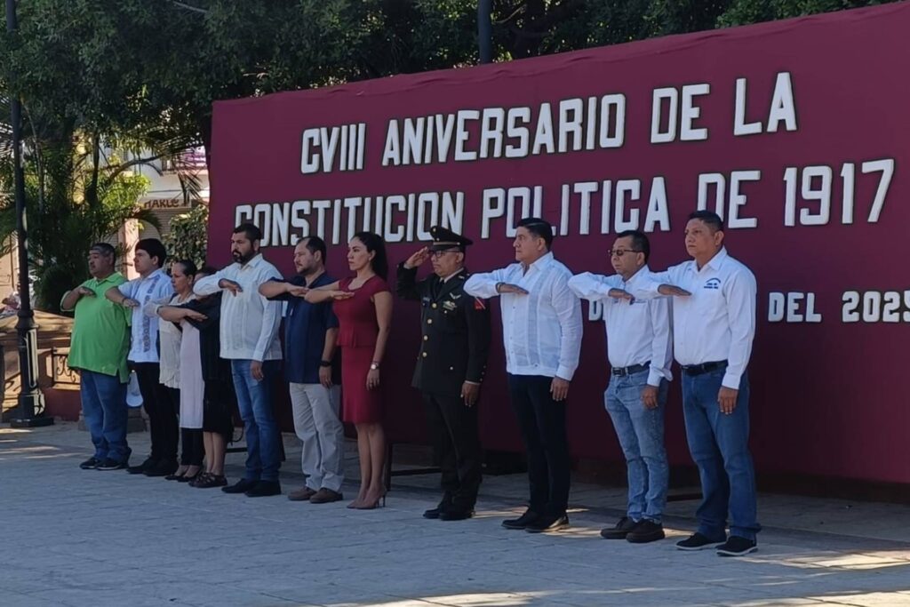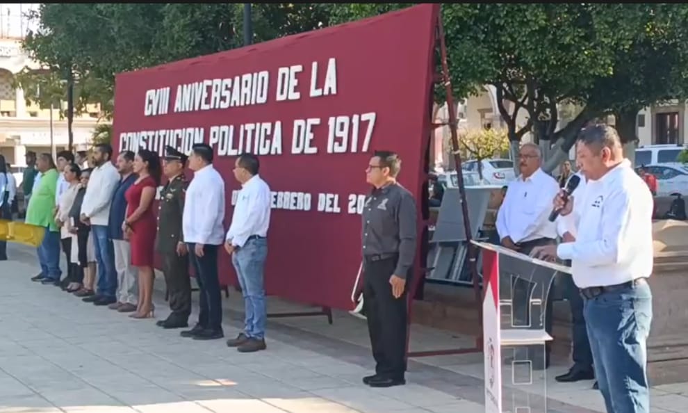 En el marco del CVIII Aniversario de la Constitución Política de los Estados Unidos Mexicanos de 1917; la Alcaldesa Fanny L. Arreola Pichardo, acompañada por: Francisco Aguilar Rodríguez, sindico municipal; Iván Santamaría Granados, titular de la URSE; del profesor Edgar Adame Rincón, director regional de los Programas del Bienestar; Teniente Coronel de Infanteria Juan Jose Alvarez Corona, representante de la 43 Zona Militar; y del Licenciado Emmanuel Gómez Sosa, orador oficial en este acto civico conmemorativo.
