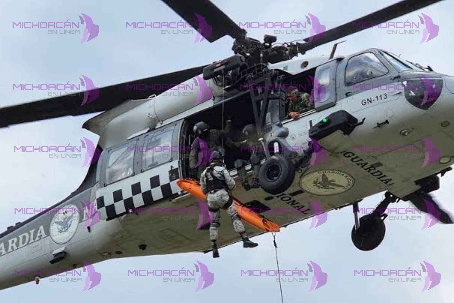 Debido a que la zona es de difícil acceso para vehículos, los elementos lesionados fueron auxiliados y extraídos mediante torno de salvamento, con el apoyo de un helicóptero de la Guardia Nacional, siendo trasladados de inmediato al Hospital Militar de la 43 Zona, en el municipio de Apatzingán, donde reciben atención médica especializada.