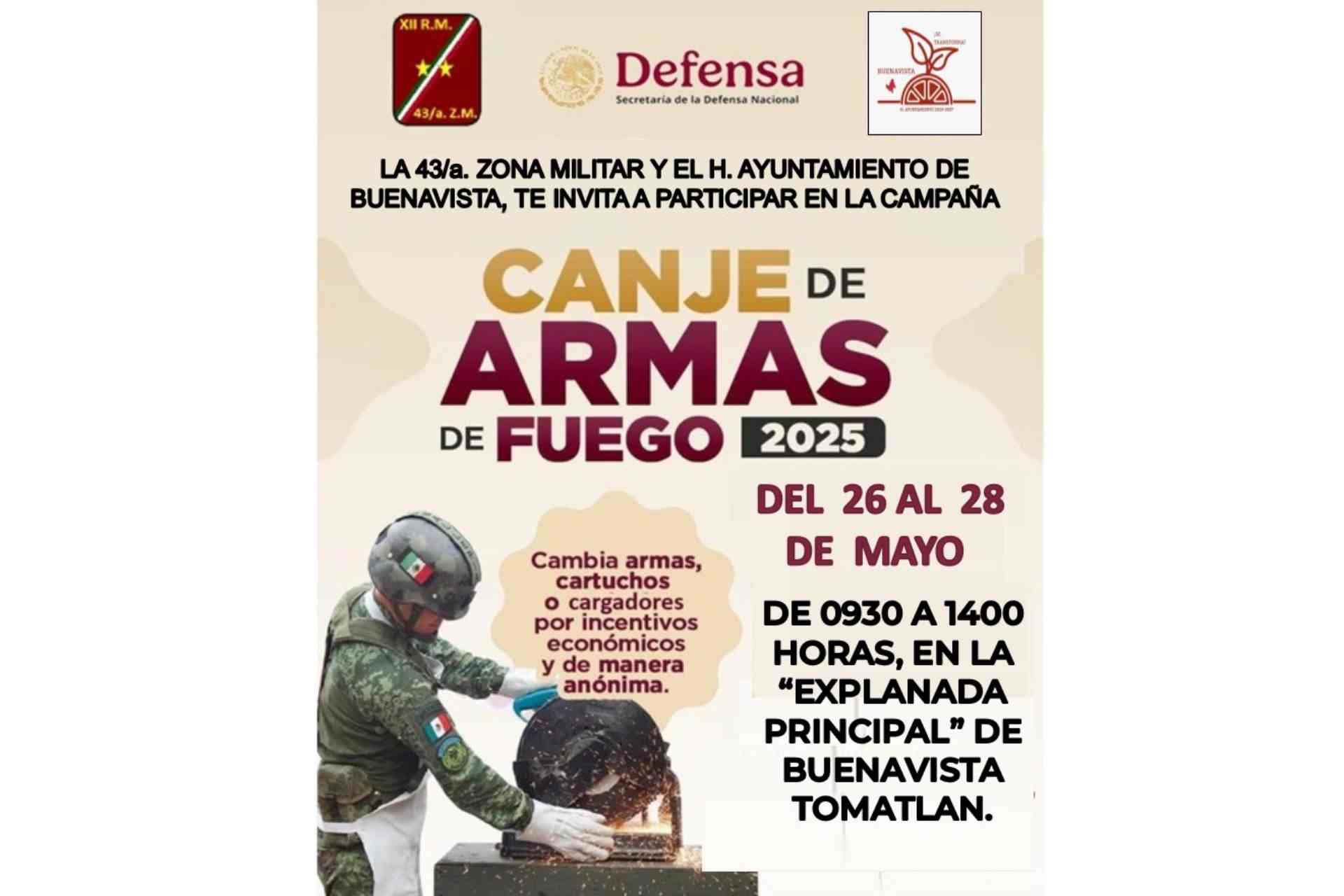 La Comandancia de la 43/a. Zona Militar con sede en Apatzingán, por conducto del 30 Batallón Infantería y en coordinación con el H. Ayuntamiento de Buenavista, que preside la alcaldesa Irma Mendoza Moreno; realizarán este Lunes 26 May. La instalación de módulos de campaña de canje de armas.