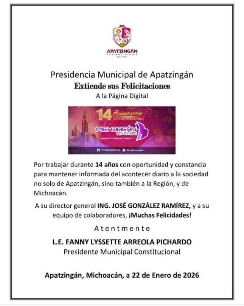 Extiende sus felicitaciones al portal de noticias de MICHOACÁN EN LÍNEA, por estar cumpliendo sus 14 años de estar informado oportunamente el acontecer diario del municipio y la región de Apatzingán, así como del Estado de Michoacán y del país.