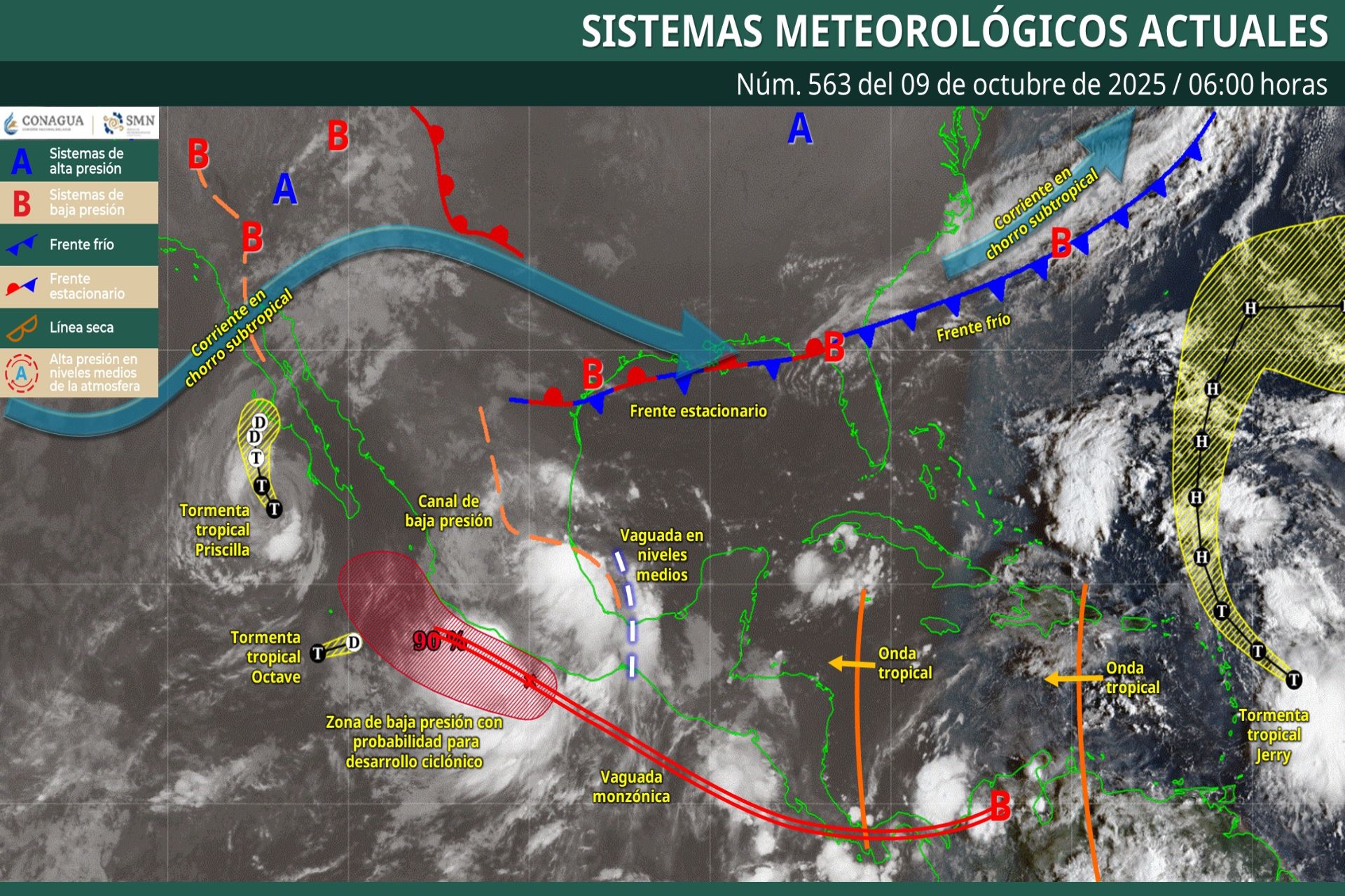 Este día, la tormenta tropical Priscilla continuará su desplazamiento paralelo a la costa occidental de Baja California Sur, por lo que su circulación y bandas nubosas mantendrán vientos y lluvias fuertes, además de oleaje elevado en dicha región. Por otra parte, una zona de baja presión con probabilidad para desarrollo ciclónico o posible ciclón tropical, se localizará frente a las costas de Guerrero y Michoacán, su extensa circulación y desprendimientos nubosos, en interacción con un canal de baja presión sobre el noreste y oriente del país, además de los desprendimientos nubosos de la vaguada monzónica en el Pacífico Sur Mexicano, mantendrán un temporal de lluvias muy fuertes a intensas en las regiones mencionadas, además del sur y sureste del territorio nacional. Simultáneamente, se prevén lluvias fuertes a muy fuertes en el occidente y centro del país; así como vientos muy fuertes a intensos y oleaje elevado en las costas de Oaxaca, Guerrero, Michoacán y Colima. Así mismo, un canal de baja presión sobre la Mesa del Norte aunado al ingreso de humedad del océano Pacífico y golfo de México originarán chubascos y lluvias fuertes en la región mencionada. Mientras que el ingreso de humedad originado por la corriente en chorro subtropical generará chubascos y lluvias fuertes en Baja California. Finalmente, un segundo canal de baja presión extendido sobre la península de Yucatán, aunado al ingreso de humedad del mar Caribe, originará chubascos y lluvias fuertes en dicha península.