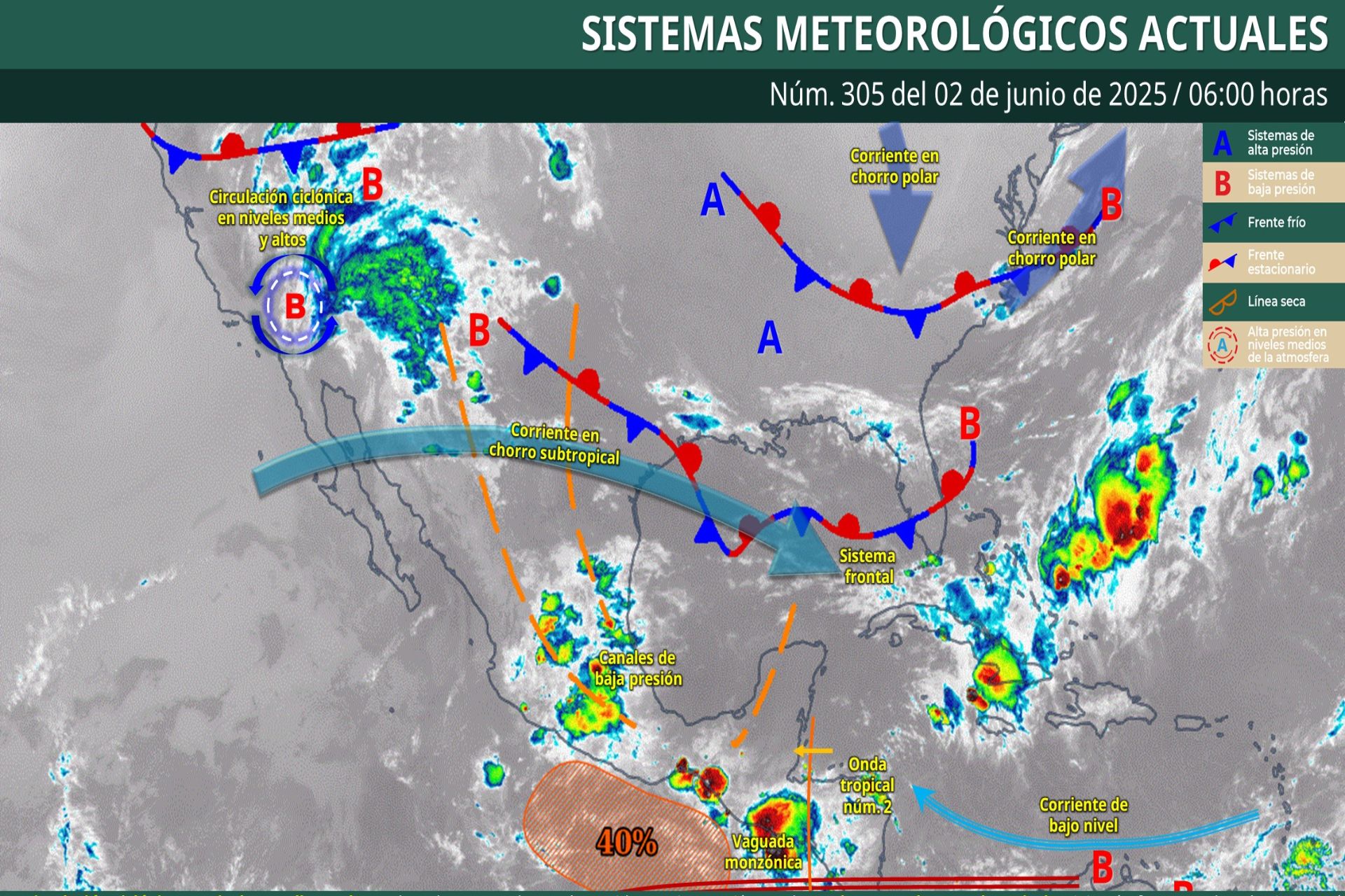 Para hoy, la circulación ciclónica en niveles medios y altos sobre el suroeste de Estados Unidos, en interacción con la corriente en chorro subtropical, originarán fuertes rachas de viento, así como lluvias con intervalos de chubascos en el noroeste y norte de México, con lluvias puntuales fuertes en Chihuahua. A su vez, canales de baja presión se extenderán sobre el norte, noreste, centro y sur del país, en combinación con la entrada de humedad del golfo de México y océano Pacífico, y con inestabilidad atmosférica, generarán chubascos con lluvias puntuales fuertes en dichas regiones, incluido el Valle de México, con lluvias puntuales muy fuertes en Michoacán, Guerrero, Estado de México, Ciudad de México, Morelos y Veracruz, y lluvias puntuales intensas en Puebla. Por otra parte, un canal de baja presión sobre la península de Yucatán, la aproximación de la onda tropical núm. 2 al sureste mexicano y la entrada de humedad del mar Caribe, ocasionarán lluvias fuertes a puntuales muy fuertes en dichas regiones, previéndose lluvias puntuales intensas en Oaxaca y Chiapas. Las lluvias anteriormente mencionadas estarán acompañadas de descargas eléctricas, fuertes rachas de viento y posible caída de granizo, así como generar, encharcamientos, inundaciones y deslaves en zonas bajas de los estados mencionados, y ocasionar el incremento en los niveles de ríos y arroyos. Finalmente, se mantendrá el ambiente caluroso a muy caluroso sobre gran parte del territorio nacional, prevaleciendo la onda de calor en zonas de Campeche, Yucatán y Quintana Roo e iniciando una nueva onda de calor en los estados de Chihuahua (sur y sureste), Coahuila (oeste y suroeste), Nuevo León (sur), Tamaulipas (sur y suroeste), Durango (noreste, este y sur), Zacatecas (norte y centro), San Luis Potosí, Aguascalientes, Sinaloa, Nayarit, Jalisco (sur y oeste), Colima, Michoacán (oeste, centro y sureste), Guerrero (oeste) y Oaxaca (centro y sur).