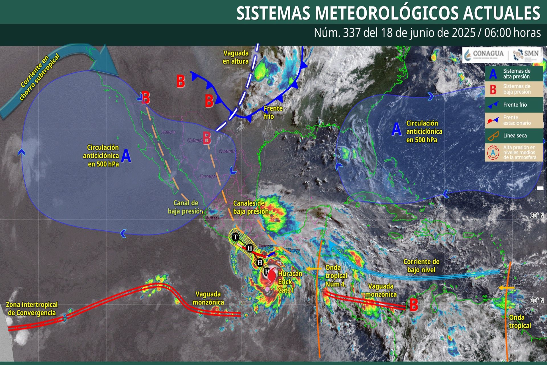 Para hoy, los desprendimientos nubosos originados por la circulación del huracán Erick de categoría 1 en la escala Saffir-Simpson frente a las costas de Oaxaca, ocasionarán lluvias puntuales torrenciales en Guerrero, Oaxaca y Chiapas, así como rachas de viento muy fuertes a intensas y oleaje elevado en sus costas. Un canal de baja presión en el sureste mexicano, interaccionará con la onda tropical núm. 4 ubicada sobre la península de Yucatán y originará lluvias puntuales intensas en Tabasco y Veracruz; y puntuales fuertes en Quintana Roo, Yucatán y Campeche. Por su parte, un canal de baja presión extendido sobre el noroeste, occidente y centro del país, en combinación con la entrada de aire húmedo del océano Pacífico y golfo de México y con inestabilidad atmosférica, generarán lluvias puntuales intensas en Puebla, Estado de México y Michoacán; puntuales muy fuertes en Tlaxcala, Morelos, Ciudad de México, Hidalgo, Colima y Jalisco; puntuales fuertes en Querétaro, Guanajuato, San Luis Potosí, Tamaulipas y Nayarit; lluvias y chubascos en Aguascalientes, Nuevo León, Zacatecas, Coahuila, Durango, Chihuahua y Sinaloa; y lluvias aisladas en zonas de Sonora. Finalmente, una circulación anticiclónica en niveles medios de la atmósfera mantendrá el ambiente caluroso a muy caluroso sobre el noroeste y norte de la República Mexicana, previéndose ambiente extremadamente caluroso con temperaturas superiores a 45 °C en Baja California, Sonora, Chihuahua y Sinaloa; además de prevalecer la onda de calor en Baja California (norte), Durango (norte y oeste) y Sinaloa (norte y centro), así como en zonas de Sonora y Chihuahua.