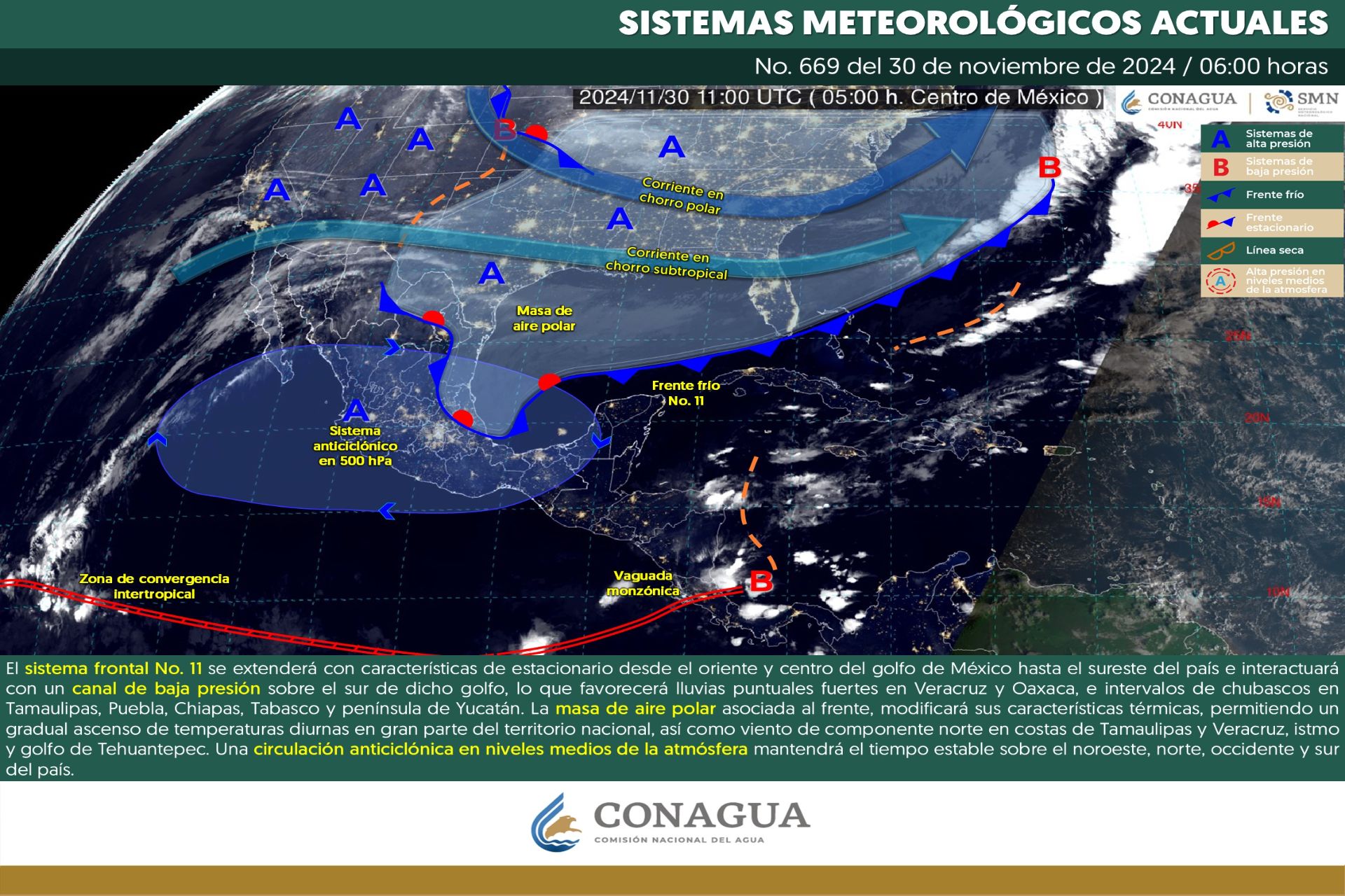 Para hoy, el sistema frontal No. 11 se extenderá con características de estacionario desde el oriente y centro del golfo de México hasta el sureste del país, interactuará con un canal de baja presión sobre el sur de dicho golfo, favorecerán lluvias puntuales fuertes en Veracruz y Oaxaca, así como intervalos de chubascos en Tamaulipas, Puebla, Chiapas, Tabasco y península de Yucatán. La masa de aire polar asociada al frente, modificará gradualmente sus características térmicas, permitiendo un gradual ascenso de temperaturas diurnas en gran parte del territorio nacional, así como viento de componente norte en costas de Tamaulipas y Veracruz, istmo y golfo de Tehuantepec. Una circulación anticiclónica en niveles medios de la atmósfera mantendrá el tiempo estable sobre el noroeste, norte, occidente y sur del país.