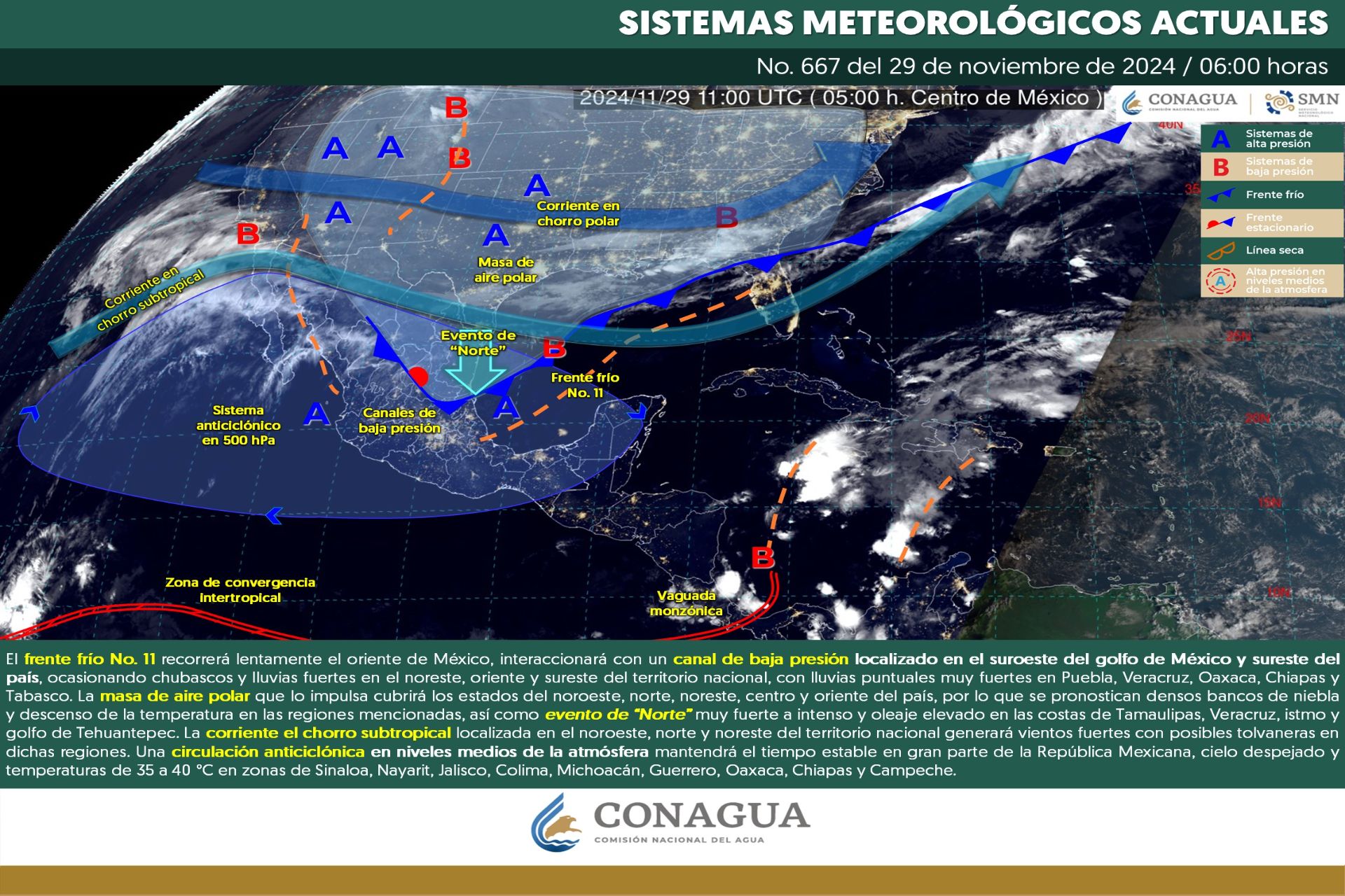 Para este día, el frente frío No. 11 recorrerá lentamente el oriente de México, interaccionará con un canal de baja presión localizado en el suroeste del golfo de México y sureste del país, ocasionando chubascos y lluvias fuertes en el noreste, oriente y sureste del territorio nacional, con lluvias puntuales muy fuertes en Puebla, Veracruz, Oaxaca, Chiapas y Tabasco. La masa de aire polar que lo impulsa cubrirá los estados del noroeste, norte, noreste, centro y oriente del país, por lo que se pronostican densos bancos de niebla y descenso de la temperatura en las regiones mencionadas, así como evento de “Norte” muy fuerte a intenso y oleaje elevado en las costas de Tamaulipas, Veracruz, istmo y golfo de Tehuantepec. A su vez, la corriente el chorro subtropical localizada en el noroeste, norte y noreste del territorio nacional generará vientos fuertes con posibles tolvaneras en dichas regiones. Finalmente, una circulación anticiclónica en niveles medios de la atmósfera mantendrá el tiempo estable en gran parte de la República Mexicana, cielo despejado y temperaturas de 35 a 40 °C en zonas de Sinaloa, Nayarit, Jalisco, Colima, Michoacán, Guerrero, Oaxaca, Chiapas y Campeche.