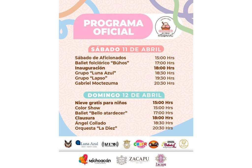 “La tradición de la nieve artesanal de Zacapu comenzó hace casi 80 años, y con este tipo de eventos buscamos que nuestros artesanos tengan una difusión estatal. Tendremos un programa de actividades culturales, musicales y gastronómicas de 12:00 a 22:30 horas”, explicó el funcionario.
